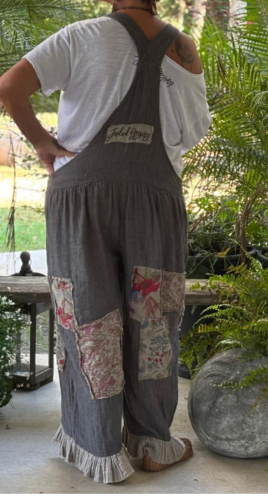 Soft and comfy overalls from Jaded Gypsy. Charcoal grey chambray fabric with awesome patches, distressing, fun ruffle pocket on the knee. Adjustable shoulder straps, a bit oversized. Available in sizes small/med and large/XL.