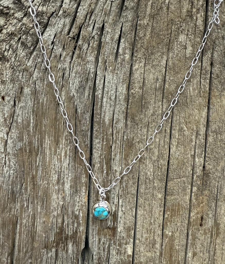 Dainty 1/2” round turquoise pendant set in .925 sterling. Includes sterling silver paper clip chain, adjusts to 19”. This listing is for round pendant only. 2nd photo is for styling options. Perfect for layering.